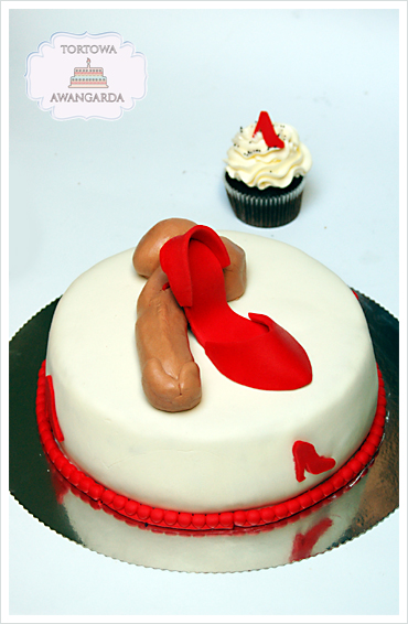 Tort wykonany na wieczór panieński w stylu filmu "Diabeł ubiera się u Prady". Do kompletu czekoladowe cupcakes z kremem waniliowym z czerwonymi szpilkami. Na samym torcie większa szpilka z widłami zamiast obcasa :). Nie zabrakło również motywu typowo "panieńskiego" :).